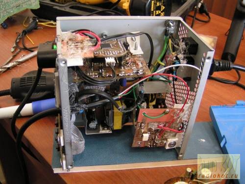 Рис. 3. Вид сверху Намотка начинается с первичной обмотки. Наматываем 11 витков в 2 провода начиная с 3 ножки трансформатора, заканчиваем на 2 ножке. Далее делаем два слоя изоляции. Следующей наматываем обмотку обратной связи. Мотаем 3 витка в 2 жилы, начиная с 5 ножки, заканчиваем на 4 ножке. Делаем два слоя изоляции. Следующей мотается выходная обмотка. В четыре провода, начинаем на 9,10 (два провода припаиваем к 9 ножке, оставшиеся два к 10 ножке) и заканчиваем на 7,8 (два провода припаиваем к 7 ножке, оставшиеся два к 8 ножке). Делаем два слоя изоляции. И последней доматываем первичную обмотку, делаем 11 витков в 2 провода, начинаем со 2 ножки, заканчиваем на 1. Первый пуск блока производим через лампу накаливания 220 Вольт 60 Ватт, впаянную вместо предохранителя F1. Данный прием убережет нас от БАХа, если что-нибудь собрано не так. В нагрузку вешаем две лампы 12В 5Ватт, соедененные последовательно. Если все собрано правильно, при включении вспыхнет и погаснет лампа на входе, лампы на выходе должны засветиться на полную. Выключаем, проверяем нагрев элементов. Включаем повторно, даем поработать, выключаем, проверяем нагрев элементов. Если все нормально, можно выпаивать лампу и ставить предохранитель на место. Опять проверяем... Если надо подстроить напряжение на выходе, можно поиграться значениями резисторов R4 (R13) и R10. В моем случае был увеличен резистор R13 с 1 кОм до 2,49 кОм, что привело к увеличению напряжения при нагрузке 2,2А до необходимых 24В. К слову сказать, я ставил все резисторы с допуском 5%. Все работает как надо. В заключении хотелось бы сказать, что ИМС серии TOP24х мне понравились. По крайней мере умирали они тихо. Кстати, интересный момент, если блок запускается, выходин на заданную мощность, а потом уходит в перезапуск (где-то раз в секунду), то ,скорее всего, отсутствует сигнал обратной связи. Можно проверить выпаяв оптопару, должно быть тоже самое... И еще, печатную плату можно использовать и с другими ИМС серии TOP24х. Схемотехника у них одинаковая. Шаг 2. Цифровая паяльная станция на PIC16F88x/PIC16F87x(a). Далее будет описан процесс сборки и настройки самодельной паяльной станции. Можно сказать, что данный проект является еще одним клоном ПС представленных на сайте ). Можно использовать разные МК (PIC16F886/PIC16F887, PIC16F876/PIC16F877, PIC16F876a/PIC16F877a). Так же задействован встроенный в фен геркон. Схема цифровой части устройсква представлена на Рис.4. Для наглядности показаны два МК: IC1 - PIC16F887, IC1(*) - PIC16F876. Другие МК подключаются аналогично, на соответствующие порты. Рис. 4. Цифровая часть Схема силовой части устройства представлена на Рис.5. Рис. 5. Силовая часть Информация о подключении фена, паяльника и ЖК индикатора представлена на Рис.6. Рис. 6. Подключение переферии Паяльная станция основана на МК PIC16F887 (мой вариант). Не могу сказать что это оптимальный вариант, особенно учитывая тот факт что распиновка в корпусе TQFP вызывает у меня шок и желание отрезать лишнюю часть (судя по всему, голову) у разработчиков, да и пора переходить на ARM архитектуру (к примеру LPC1114 стоит в 2-а раза дешевле а может гораздо, гораздо больше...). Просто они у меня есть, вот я и решил их пристроить... Усилитель термопары собран на широко распространенном ОУ lm358. Используются обе половины, одна для паяльника, вторая для фена, Коэффециент усиления может быть подрегулирован подстроечными резисторами VR1 и VR2. От использован