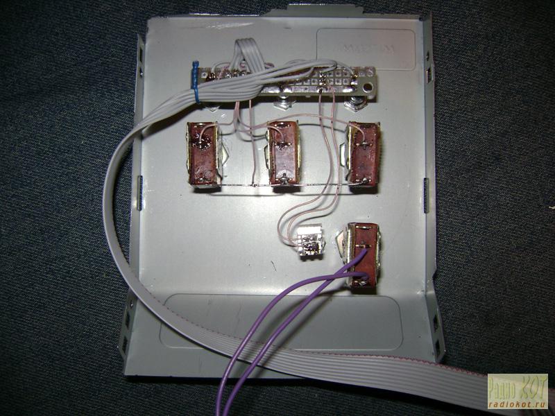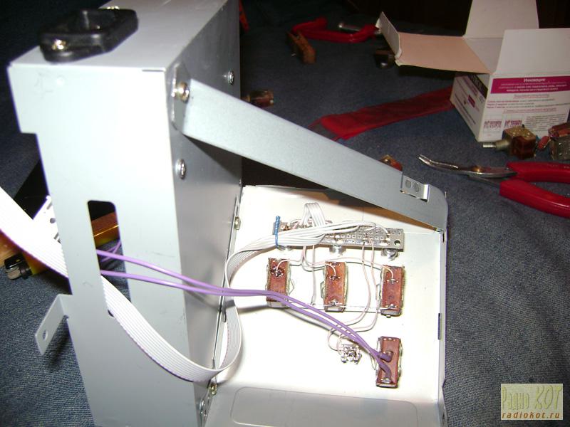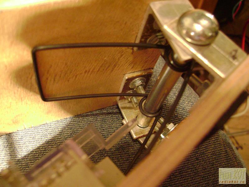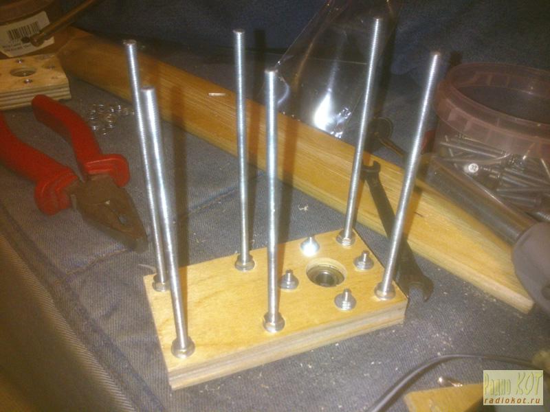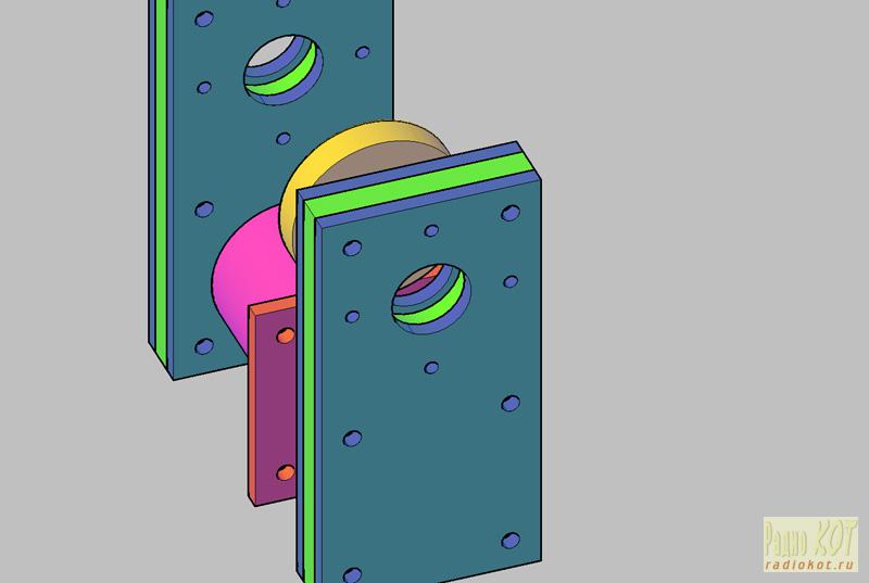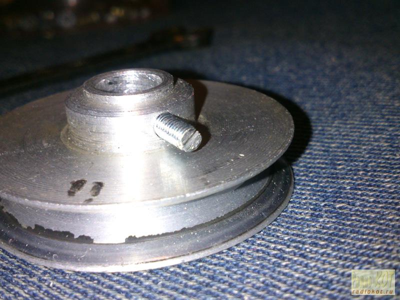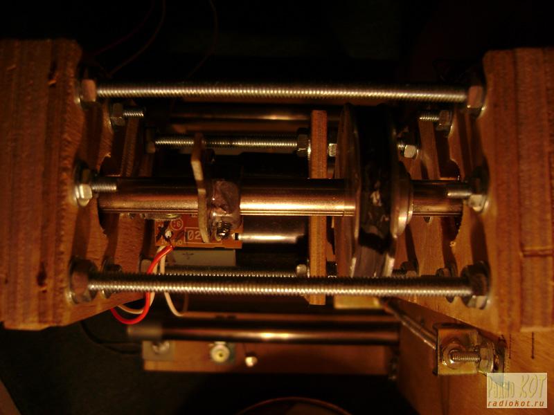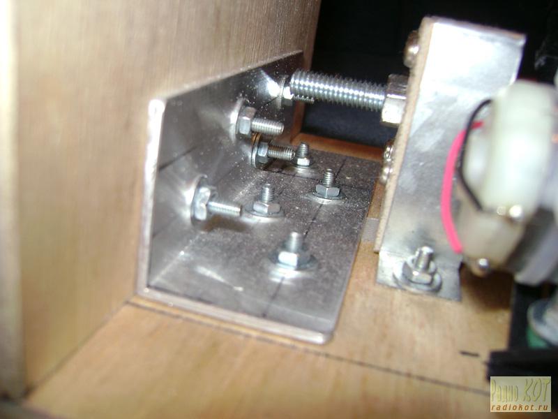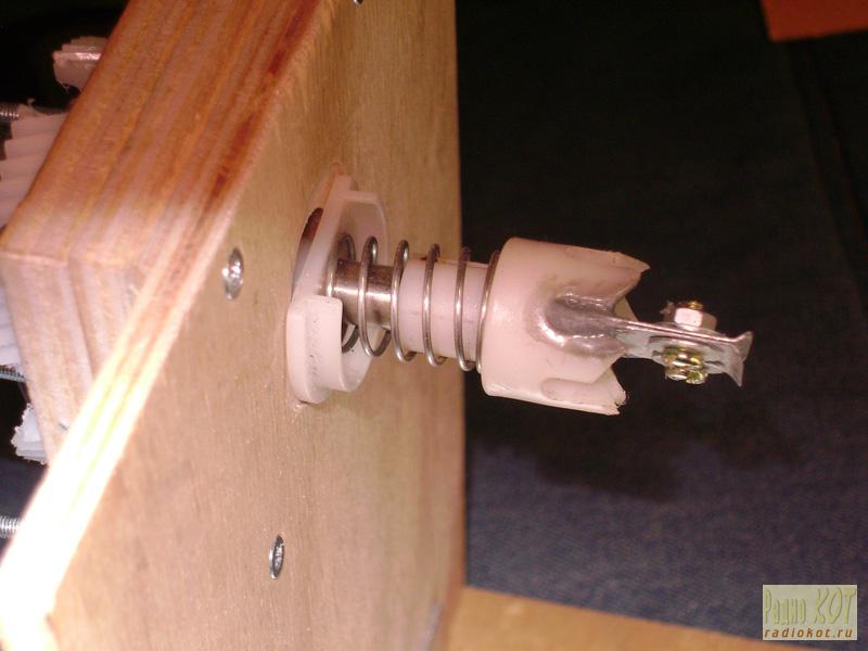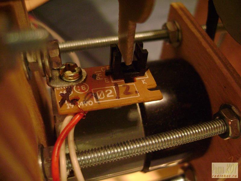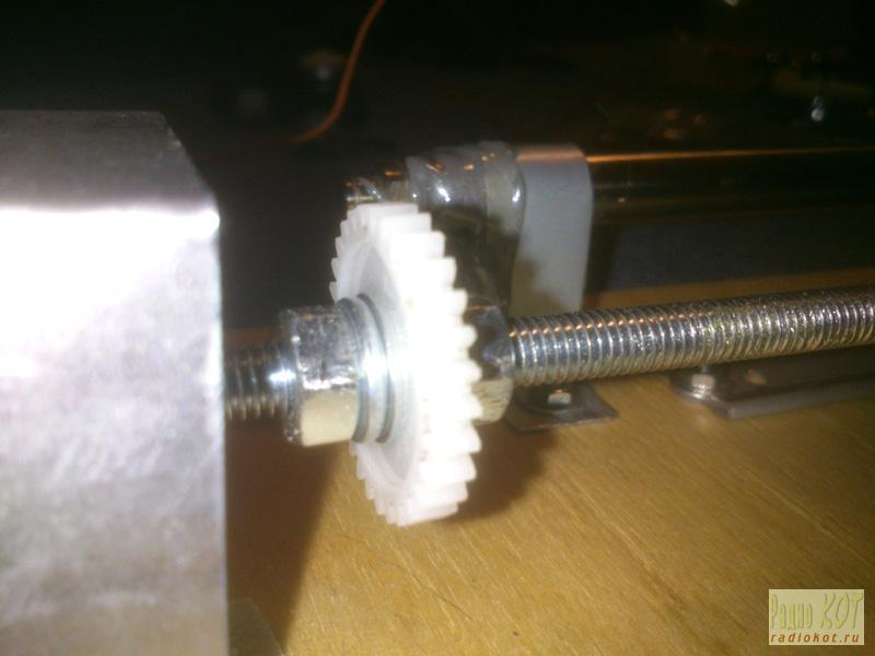 Вещица интересная. Но мне она показалась не слишком жёсткой и не особо удобной. Представьте: вам нужно поле монтажа каждой выводной детали оттягивать в сторону ручку, поворачивать на определённый угол, отпускать, потом брать паяльник, запаивать, опять поворачивать, вставлять новую деталь и т.д. по циклу. Я решил автоматизировать процесс и при нажатии педали с помощью двигателя поворачивать плату, а с помощью ещё одного двигателя и передачи винт-гайка передвигать стойку. Такому решению также способствовало огромное количество деталей от принтеров. Сразу скажу любителям чертежей: они практически не делались, всё размечалось по месту, да и зачем нужны чертежи, если у всех исходные детали (моторы, направляюцие и т.д.) разные? Сборка механической части Покопавшись в куче деталей от принтеров, я нашёл многое из того, что необходимо для данного устройства: Перечислю некоторые из них: сверху - направляющая от принтера, снизу - вал 8 мм, в среднем ряду слева направо: каретка от принтера, электромагнитная муфта от лазерного принтера, шкив и двигатель от счётчика купюр, два подшипника 8 мм из личных запасов. Для начала вырезаем их фанеры 8 мм прямоугольник 300*150, это будет основание устрйства. Далее из фанеры 6 мм делаем два прямоугольника 200*150 мм для стоек держателя. Разрезаем каретку от принтера, чтобы получить две боковины с отверстиями для направляющих. Напрявляющую разрезаем пополам. Из кусочков фанеры и стеклотекстолита вырезаем подкладки под направляющие, чтобы их центры были примерно на высоте 26 мм относительно основания. Делаем 4 скобы для сжатия всех этих бутербродов. В скобах делаем крепёжные отверстия так, чтобу винт в них перемещался перпендикулярно оси направляющей. Направляющие устанавливаем на расстоянии 100 мм друг от друга. При этом не забываем на них надеть части каретки. Если вы ещё не поняли, что имелось в виду, смотрите на фото: Устанавливаем части каретки примерно по середине направляющих. Берём фанерный прямоугольник для стойки, снизу вырезаем пазы, чтобы туда вошли напрявляющие. Устанавливаем его на части каретки, угольниками выставляем вертикальность краёв и перпендикулярность направляющим. Фиксируем с помощью струбцин и размечаем положение частей каретки на стойке маркером. С одной стороны снимаем крепежи направляющих и стаскиваем части каретки. Совмещаем их по разметке на стойке и сверлим отверстия. Далее крепим винтами. Возвращаем готовую стойку на место, закрепляем направляющие. Теперь, передвигая концы напрявляющих (тут нужны специальные отверстия в скобах), настраиваем систему так, чтобы каретка свободно двигалась в обе стороны при нажатии пальцем в середину на уровне направляющих. От этого зависит правильность работы устройсва, поэтому сделайте это особенно тщательно. После настройки можно залить крепежи клеем. Далее делаем упор для стойки, чтобы при зажимании платы на направляющие приходилась меньшая нагрузка. Под карекой между направляющими крепим два металлических "рельса". Я свои сделал из детали принтера. Собираем две одинаковых детали, состоящих из уголка, резьбовой шпильки 4 мм, держателя подшипника и самого подшипника. Держатель и подшипник я добыл из счётчика купюр, там они прижимали купюры к датчику. Крепим это на каретке вертикально так, чтобы подшипники при вертикально стоящей каретке кати