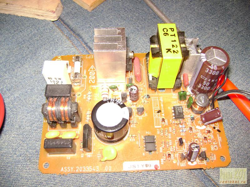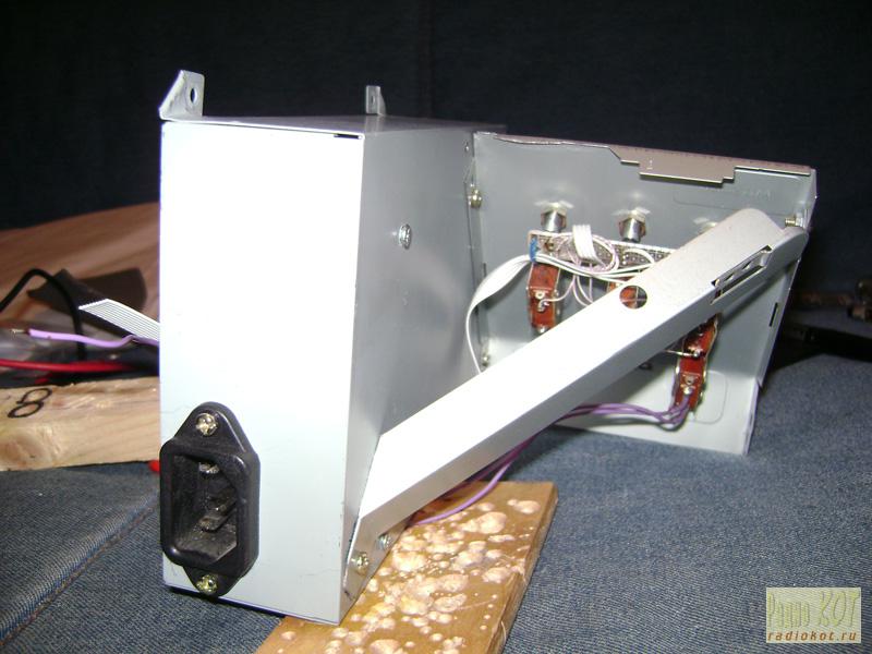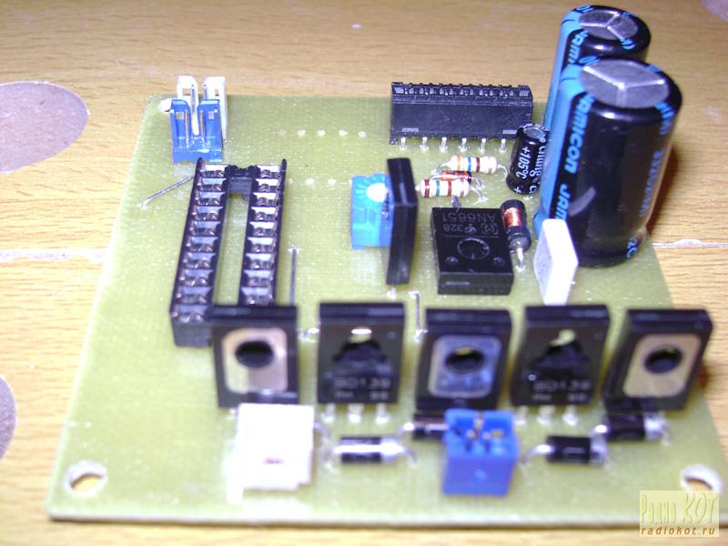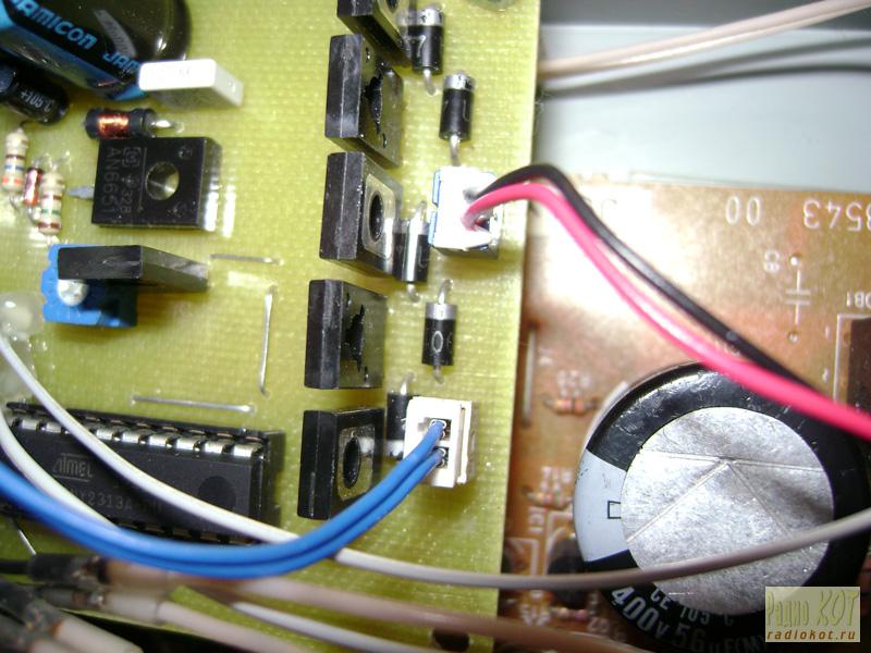Теперь нужно изготовить привод для поворота платы. Это весьма сложная конструкция, поэтому я сделал её 3D-модель. Вот она: Чертежи: "Синие" детали делаем в количестве четырёх штук из фанеры 4 мм, "зелёные" - 2 штуки из фрезерованной до толщины подшипника фанеры 8 мм, "красная" деталь в одном экземпляре из фанеры 4 мм. В последней нужно разметить и просверлить отверстия для крепления двигателя. Расстояние между передним крепежом и деталью для двигателя - 25 мм, а сзади - 45 мм. Процеес сборки виден на фото: На последнем фото вставлен для пробы вал 8 мм. Теперь подготавливаем шкив. Делаем держатель шкива из деревянного бруска: Сверлим в шкиве отверстие для нарезки резьбы М3: Нарезаем резьбу. Отрезаем шляпку винта М3 и вкручиваем его. Теперь делаем датчик поворота. На одном из винтов крепежа заднего подшипника с помощью уголка крепим маленькую оптопару от принтера. К пластинке из стеклотекстолита специальной формы с просверленным отверстием припаиваем предварительно высверленную гайку М8. В гайке сверлим отверстие, нарезаем резьбу так же, как и в шкиве. Обрезаем вал и делаем канавки для стопорных колец. С одной стороны делаем пропил и вклеиваем такой же держатель, как тот, что мы вклеивали в шестерню тормоза. Собираем всё это. В качестве пассика я использовал водопроводную прокладку, обрезаннную ножом. До этого проверял работу механизма обычной резинкой. Устанавливаем привод на правую стойку, следим за высотой вала. Она должна совпадать с высотой вала тормоза (относительно основания). Следующий важный этап - установка привода для движения правой стойки. Я использовал мотор с редуктором от принтера Epson. Я криво закрепил шестерню на резьбовой шпильке, поэтому пришлось придумывать крепёж привода. Я его закрепил так: с одной стороны силиконовой шайбой и длинным винтом, а с другой - пружиной и винтом. Для выравнивания потребовалась ещё одна пружина. Подробнее - на фото. Так это выглядит сверху: И наконец, осталось закрепить концевые выключатели (концевики) справа и слева и металлическую пластинку на каретке, нажимающую на них. Общий вид получившейся механической части: Сборка электронной части Схема контроллера приводов ниже: Пояснять особо нечего. Управляет всем микроконтролер ATTiny2313. Двигатель перемещения каретки включен через Н-мост на транзисторах. Диоды D7 и D9 кроме защитной выполняют ещё одну функцию. Они используются для торможения двигателя открытем транзисторов Q2 и Q5 одноременно. (Подумайте, как течёт ток при вращении мотора в разные стороны при открытии этих транзисторов.) K1 - обмотка электромагнита тормоза. SW3 - переключатель педали (см. ниже). Из-за нехватки стандартных внешних прерываний испоьзован не по прямому назначению вывод ICP (PD6). Фьюз-биты ATiny2313 выставляем на внутренний генератор 8 МГц: AN6651 - стабилизатор для двигателя. Схема его включения была срисована с платы, стоящей на моторе поворота. Саму эту плату я отпаял, так как доступа к двигателю после сборки не будет, а скорость, возможно, потребуется отрегулировать. Печатная плата сделана методом ЛУТ. Вот она: Несколько фотографий процесса монтажа: Для удобства дальнейшей сборки я использовал различные разъёмы из принтеров. Теперь стоит подумать о том, как всё это питать и где поставить. Первая проблема быстро решилась: был найден импульсный БП о принтера. Обратная связь была пределана