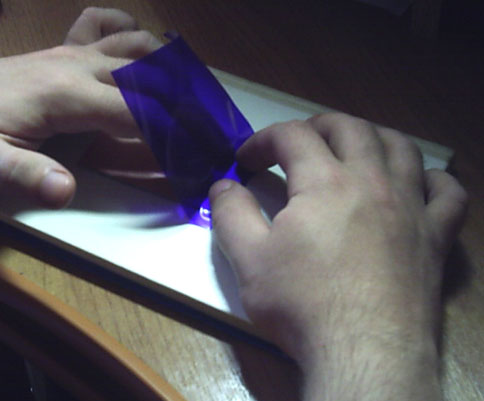 Удерживая кусочек снятой пленки пальцами прикладываем его на край заготовки из стеклотекстолита и разравниваем пальцами с умеренным давлением для того, что бы пленка прилипла, как следует.