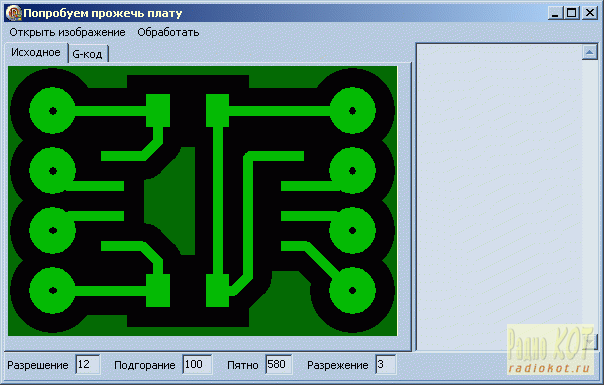 Исходными данными для неё является растровое изображение платы с разрешением 600 точек на дюйм (другие разрешения не поддерживаются). Чёрный цвет считается изолирующим зазором, остальные – игнорируются. Программа содержит только четыре настройки. Разрешение – в искрах на миллиметр. Подгорание – укорачивание электрода от одной искры в нанометрах – позволяет компенсировать износ постепенным опусканием электрода по мере печати. Пятно – диаметр электрода в микрометрах (можно установить немного меньше фактического). Разрежение – сокращает количество прожигаемых точек для экономии моторесурса. После нажатия на кнопку «Обработать» выполняется преобразование. Тут надо быть осторожнее. Поскольку кнопки «остановить обработку» нет, лучше начинать с картинок поменьше. Здесь видно, что из-за слишком большого диаметра электрода остаются перемычки между некоторыми площадками, но более подходящей проволоки, к сожалению не нашлось. Отверстия в площадках так же слишком малы. Красными точками обозначены места опускания электрода. Результат можно скопировать из текстового окна справа в буфер обмена и вставить в программу управления 3D-принтером (например Repiter-Host). G-код должен быть совместим с большинством RepRap-ов. Для начала работы необходимо вручную выставить электрод в предполагаемый нижний левый угол платы и опустить его до контакта с поверхностью. После запуска электрод будет поднят на 0,5 мм и перенесён к первой прожигаемой точке. По мере работы высота подъёма будет постепенно уменьшатся в соответствии с настройкой «Подгорание». По этой причине слишком большое значение может привести к сбою процесса. Результаты