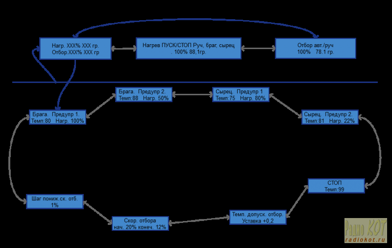 4. Схема электрическая принципиальная. Схема выполнена на микроконтроллере Atmega8. Внутренний тактовый генератор 8МГц. Индикатор символьный 1602, базе контроллер HD44780 со встроенной кириллицей. Орган управления - энкодер со встроенной кнопкой. Пищалка без встроенного генератора. Датчики температуры DS18B20 подключенные по схеме с паразитного питания, подключение по трехпроводной схеме не допускается. Вся схема питается от 12В. Такое питание нужно для насоса, при использовании другого насоса или клапана, питание должно быть соотвествующим. 5. Структура меню и использование. Структура меню делится на два раздела. Рабочий (верхний на схеме) и настройки (нижнее). Переход от меню к меню в одном разделе производится вращением энкодера. Вход в меню, короткое нажатие. Переход по параметрам в меню - короткое нажатие. Изменение параметра - вращение энкодера. Выход из меню - долгое нажатие. Переход из рабочего раздела в раздел настройки долгое нажатие из основного (первого меню). Возврат в рабочий раздел, долгое нажатие из любого меню раздела настройки.