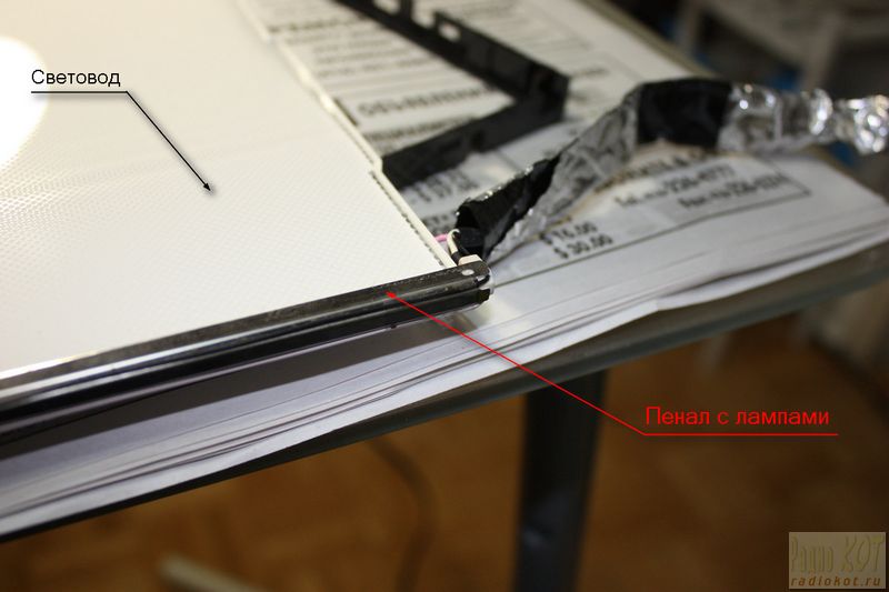 ЖК матрица вне среды своего обитания На верхнем фото (слева) видна оставшаяся часть панели: черная рамка, фильтры, а под ними световод с пеналами ламп. Снимаем пакет фильтров (снимать лучше все сразу) и кладем их на другой разворот газеты (запоминая, какая из сторон идет наверх). У фильтров обе стороны работают на просвет, и пыль на любой из них может быть видна на экране. Поэтому сверху тоже накрываем газетой. Вытаскиваем световод с пеналами ламп, смотри фото ниже.
