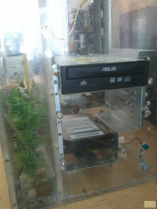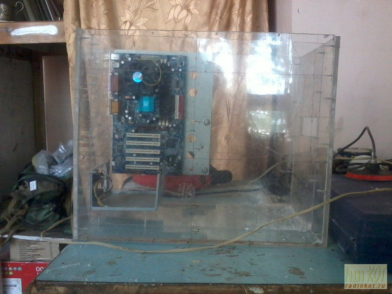 плекс (орг стекло ) 8мм - зависит от его желаемого размера; силикон; саморезы 3мм-1.5мм; самоклейка (самоклеющиеся обои, цвет по вкусу); паяльник; система от рабочего компа; светодиоды, кол-во зависит от желаемого эффекта; инструмент (дрель, рулетка, электролобзик, напильник или наждак и прочие отвертки, плоскогубцы и т.д.) и самое главное - ровные руки и светлая голова. ВНИМАНИЕ !!!! НЕ ЗАБЫВАЕМ ПРО ТЕХНИКУ БЕЗОПАСНОСТИ,ДЕВАЙСОВ МОЖЕТ БЫТЬ МНОГО---ЖИЗНЬ ОДНА Теперь поехали! Размечаем лист плекса, пока не начали его кромсать, подскажу - примерьте материнскую плату, винчестер, бп, привод - как лучше их разместить. Я снял параметры с корпуса системника и прибавил 6см для аквариума. Ну что, примерили? Теперь берем электролобзик и вырезаем 6 частей: 2 - передняя и задняя стенка, 2 - боковые, 1 - разделительная, устанавливается между системником и аквариумом (должна быть чуть поменьше) + дно. Так как плекс толстый, сверлим отверстия в передней и задней стенке, и прикладывакм к боковым так, чтобы можно было просверлить в торцах (сверло надо выбирать чуть меншего диаметра, чем саморез). Просверлили, отлично, теперь берем саморезы и отвертку и скручиваем каркас. Надеюсь, у вас все получилось и видим такую картину Продолжаем. Теперь ищем неровности и с помощью наждака или напильников все их сводим к нулю, чтобы стенки плотно прилегали друг к другу. Дальше вынимаем из старого системника панель для крепления материнки и крепим в отсек нашего творения, цепляем на нитках материнку и размечаем тех отверстия под платы расширения и разьемы подключения.