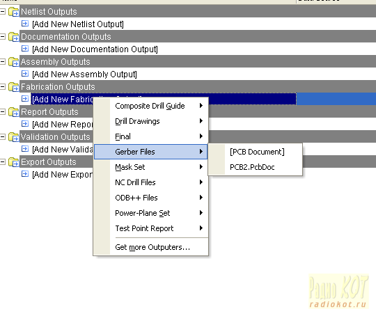 Любые последующие исправления разводки платы могут перечеркнуть нашу дальнейшую работу, так что внимательно проверяем нашу разводку еще раз. Перед продолжением нужен последний штрих – отрисовка контура платы. Выбираем Multilayer и через меню Place->Line рисуем контур. на картинке он виден серым контуром вокруг платы: Далее нам нужно подготовить выгрузку Gerber файлов и файлов сверловки из Altium Designer. Самый удобный инструмент для этого – так называемый «Output Job File» (здесь и далее ссылки будут на анголоязычные версии программного обеспечения). Добавляем в проект Output job file: После чего добавляем генерацию Gerber файлов: Нас устроют все параметры по умолчанию, единственное, что нужно сделать – включить экспорт всех слоев, внизу на кнопке «Plot Layers» выбираем «All On». Сначала выбираем «Configure» по правой клавише мышки: Следующим шагом добавляем генерацию файлов сверловки – NC drills: