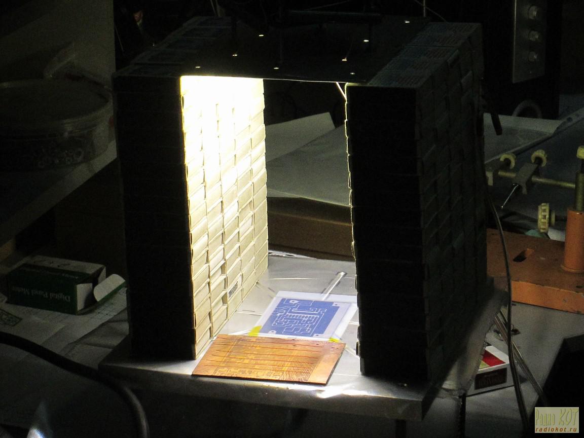 Здравствуйте. Хочу поделиться с Вами своими нароботками в области изготовления печатных плат фотометодом. Лет пять назад я засвечивал шаблоны выведенные на кальке струйным принтером разбитой лампой дрл....Но результат был не всегда хорошим. Высокие требования к черноте шаблона, и трудность изготовления больших плат....потом стал засвечивать обычной 20 ватной белой энергосберегайкой, стало лучше, но страдала равномерность засветки....и вот я решил рискнуть попробывать использовать обычные белые трёхватные светодиоды холодно белого спектра...и вот что вышло... Клеим бумагу на лист алюминия Керним, сверлим... Пайка светодиодов к подложкам на электроплитке Расстановка и приклейка светодиодов Паяем провода... Крепим вентилятор Вакуумный столик Процесс засветки и испытаний....очень ярко!